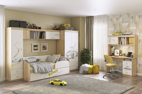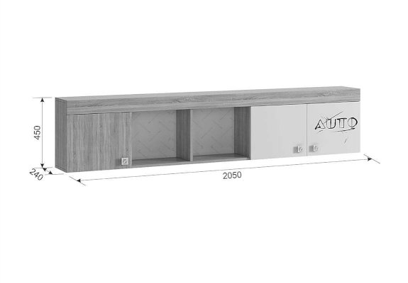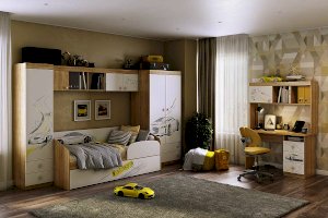 В закрытые шкафы и открытые ниши поместятся все учебники книги и сувениры. Эффектный принтерный рисунок на фасадах выдержан в общем стилистическом решении. Рисунок устойчив к истиранию и ультрафиолету. Можно повесить между шкафов над софой или использовать как самостоятельное изделие.