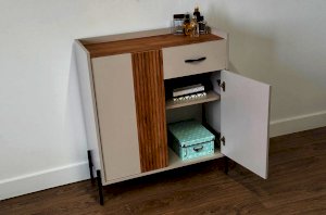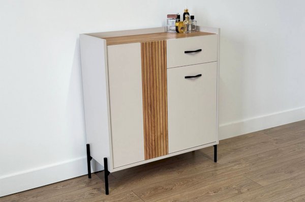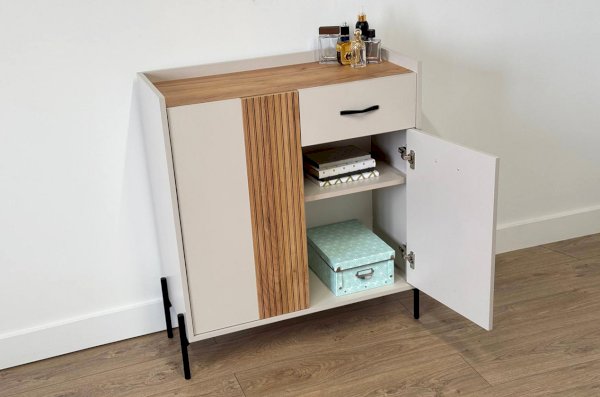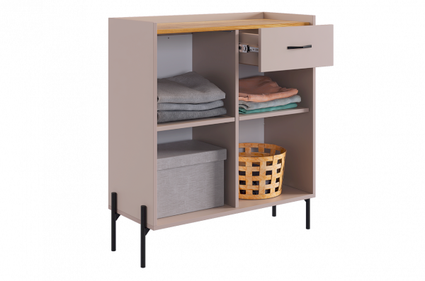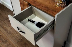 С другой стороны комод оборудован выкатным ящиком, который обеспечивает легкий доступ к часто используемым предметам. Под ним расположен большой глухой фасад, скрывающий за собой просторное хранилище для более крупных вещей.