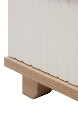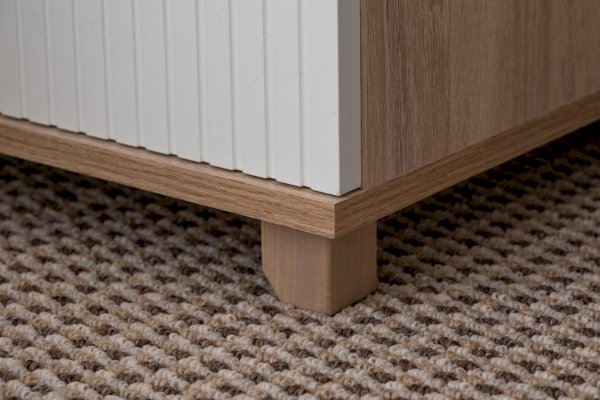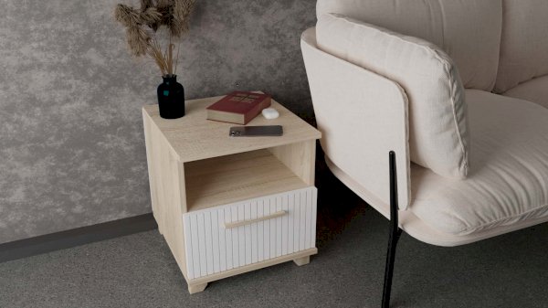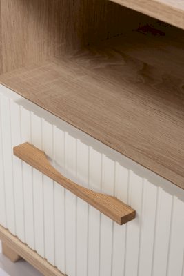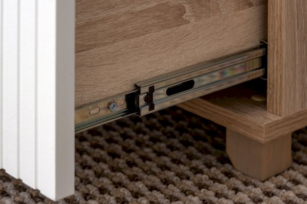 Данная модель тумбы оснащена открытой нишей и выдвижным ящиком. Ящик оборудован шариковыми направляющими полного выдвижения. Удобство использования дополняет деревянная ручка из массива дуба.
