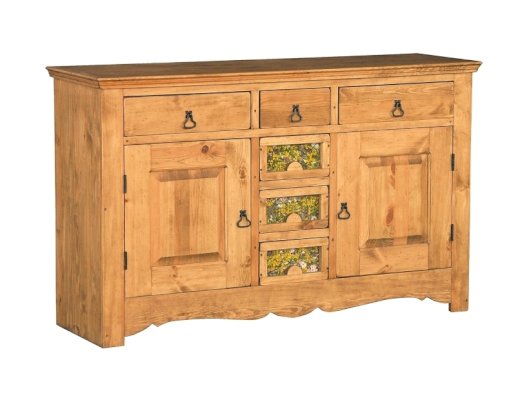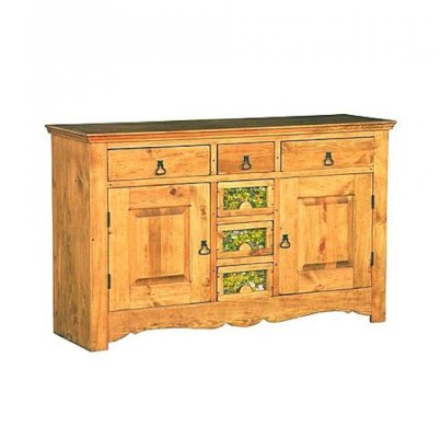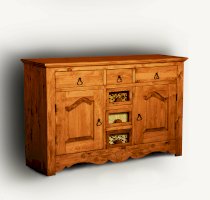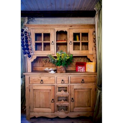 Ручка Груша Буфет из массива сосны ENSEMBLE 150. Широкий буфет оценят и любители оригинальных интерьеров, и практичные хозяева. Комплект из нижней тумбы и верхнего буфета выполнен в стиле Прованс. За стеклянными дверцами можно хранить праздничные сервизы, семейные раритеты, интерьерные вещицы. Задние стенки всех буфетов набраны из дощечек массива сосны. Также из массива сосны набраны днища ящиков. В конструкции нет элементов из фанеры, ДСП, или МДФ.
