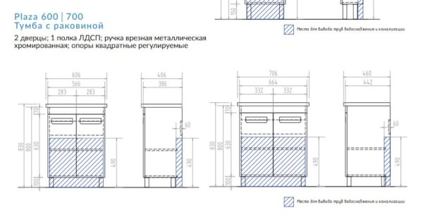 2 дверцы; 1 полка ЛДСП; ручка врезная металлическая хромированная, опоры квадратные регулируемые.