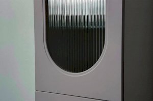 Модель оснащена одной распашной дверцей с вставкой из прозрачного рифлёного стекла, а также двумя вместительными выкатными ящиками в нижней части для хранения одежды, текстиля или аксессуаров. Внутреннее наполнение можно выбрать в зависимости от задач: шкаф комплектуется полками или штангой для плечиков, что позволяет адаптировать его под разные потребности.