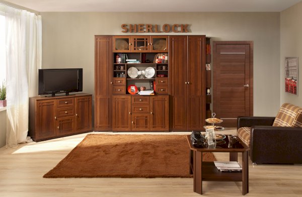 Необычная гостиная «Sherlock» (Шерлок), выполненная в брутальном английском стиле, создаст строгое и правильное настроение времен конца 19 века. Изюминка данной коллекции - это необычные для мебели рамочные фасады, дополненные тонкими накладками, что придает гостиной дополнительный шарм. Классика актуальна во все времена и не подвержена веяниям изменчивой моды. Поэтому, классическая коллекция корпусной мебели для гостиной SHERLOCK всегда будет выглядеть стильно в Вашей гостиной.