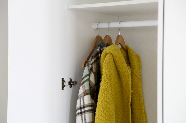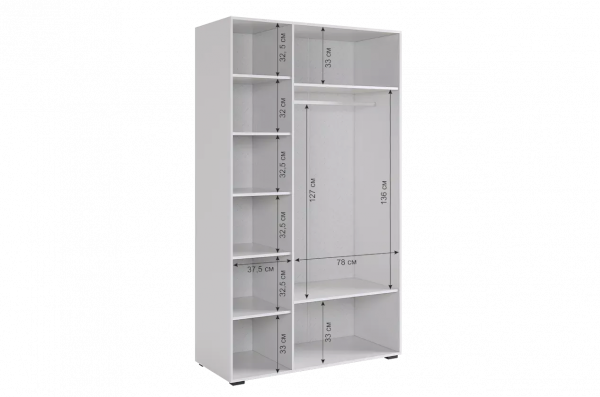 Внутреннее наполнение шкафа состоит из двух секций. Первая секция оснащена штангой и двумя полками, чтобы вы могли удобно разместить свою одежду. Вторая секция предлагает пять полок для хранения различных предметов. Важно отметить, что наше изделие обеспечивает бесшумное закрывание фасадов, что поможет Вам избежать неприятных звуков при использовании шкафа.