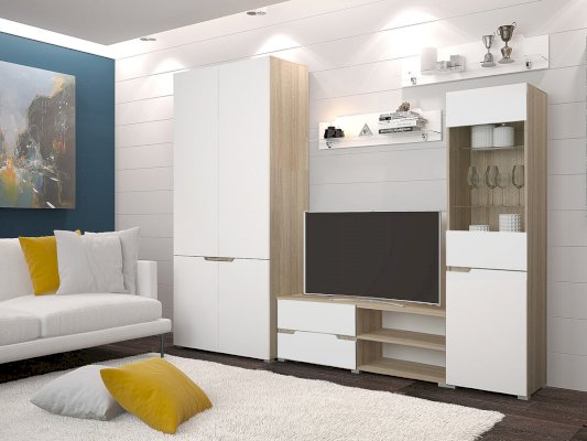 Отсутствие ручек является особенностью серии "Анталия", что придает современный и лаконичный внешний вид. В состав гостиной "Анталия" входит вместительный шкаф, а добавив комод можно получить еще больше места для хранения.