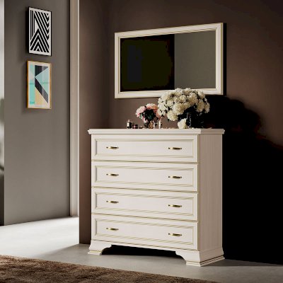 Классический комод в спальню оснащен 4-мя выдвижными ящиками. Конструкция модуля очень удобна для хранения белья или постельных принадлежностей, а ширина ящиков 817 мм делает их довольно вместительными. Высота изделия 926 мм позволяет украсить пространство вазами, сувенирами или другими красивыми предметами, разместив их на комоде.