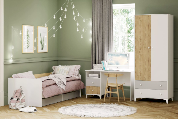 Шкаф «Морти» на высоких изящных ножках предназначен для тех, кто любит простоту и минимализм. Шкаф обладает модным сочетанием материалов и, благодаря характерным декоративным особенностям, понравится всем поклонникам скандинавского стиля. Отделение с полкой и штангой предназначено для хранения одежды на вешалках, головных уборов, коробок с аксессуарами. Два выдвижных ящика предназначены для сложенной одежды, аксессуаров, личных вещей.