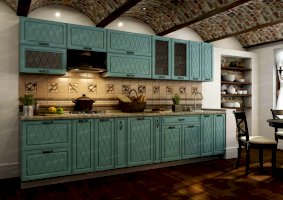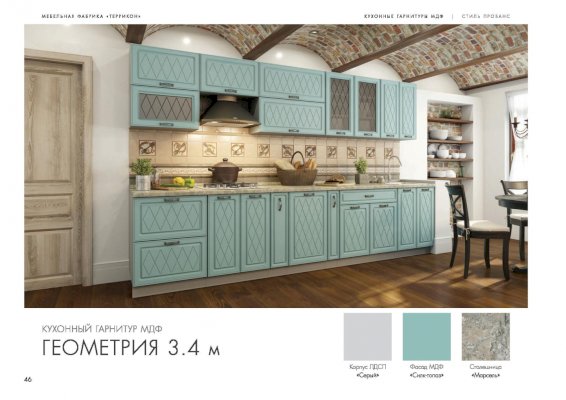 Набор кухонной мебели «Геометрия» получил свое название благодаря оригинальному дизайну. Дело в том, что его фасады украшены незатейливыми симметричными узорами, состоящими из небольших ромбов. Также комплекту присущи симметрия и простота форм. У покупателей есть возможность выбирать цветовое решение: в ассортименте изделия оттенков топаз, тирамису, гранат, алмонд.