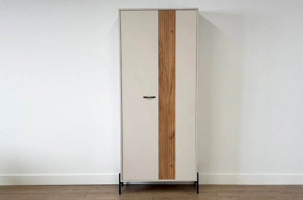 Шкаф "Доминика" оснащен глухими фасадами, скрывающими за собой просторное внутреннее пространство. На одной стороне шкафа находится штанга для одежды, обеспечивая удобное место для хранения одежды на вешалках.
