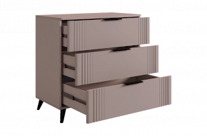 Комод изготовлен из качественных материалов: корпус выполнен из ЛДСП, что гарантирует прочность и долговечность, а фасад, выполненный из МДФ в плёнке ПВХ, не только выглядит эстетично, но и защищает комод от повреждений. Особое внимание заслуживает фрезеровка фасадов, которая придаёт изделию изысканный вид.
