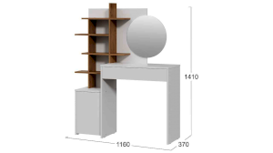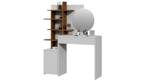 Помимо внешней привлекательности, стол достаточно вместителен. Конструкцией предусмотрено большое круглое зеркало, просторная столешница и практичный выдвижной ящик, который добавит места для необходимых мелочей. Стол также имеет открытые полки, которые позволят установить предметы декора, парфюм, украшения и многое друге.